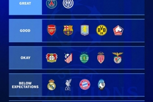 体育资讯6月3日讯 德国转会市场评价了各队本赛季欧冠的表现,并列出级别,巴黎、国米表现杰出,阿森纳、巴萨、维拉、多特、里尔优秀。
